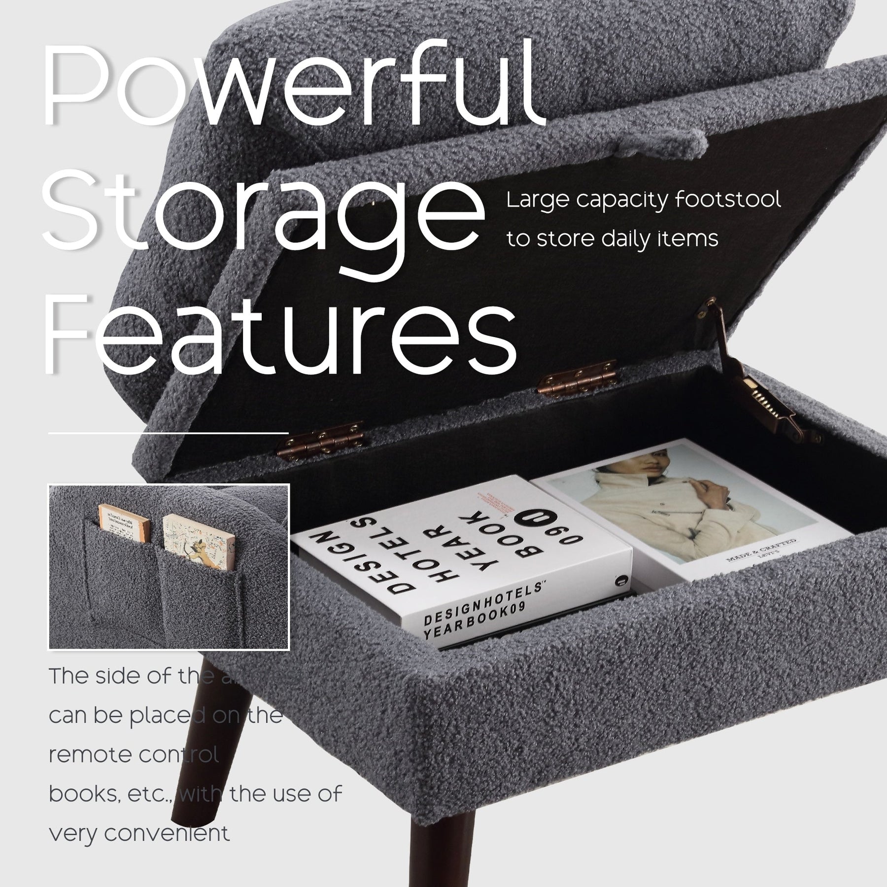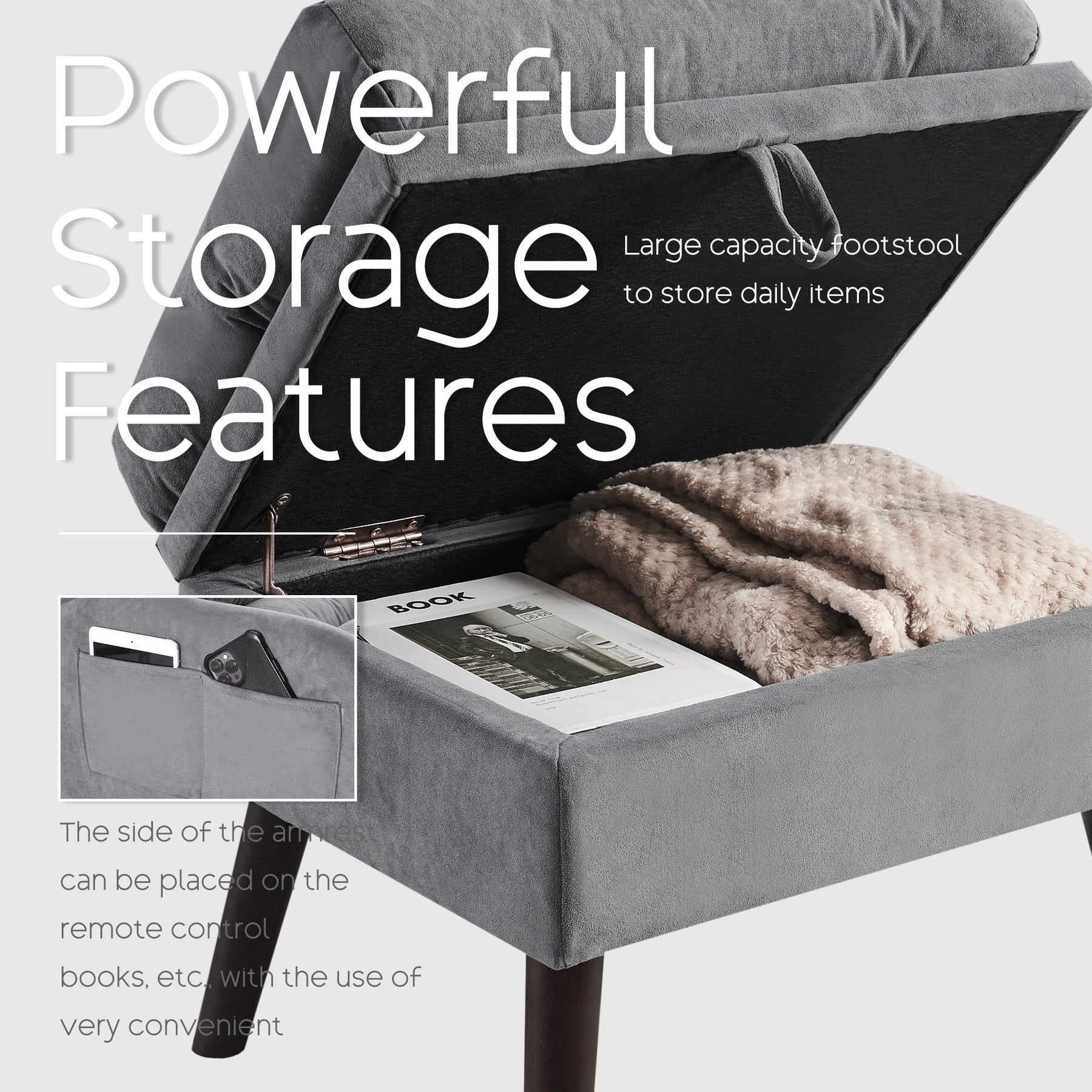 Cette chaise d'appoint avec pouf est partiellement améliorée par rapport au modèle de base d'origine, avec une grande poche de rangement ajoutée sur le côté, ce qui est pratique pour ranger tous les articles que vous souhaitez. La nouvelle fonction de rangement du pouf, un rangement quotidien polyvalent et pratique, rend votre maison plus rangée et pratique pour votre vie, pour vous offrir plus de commodité, l'article sera à portée de main.