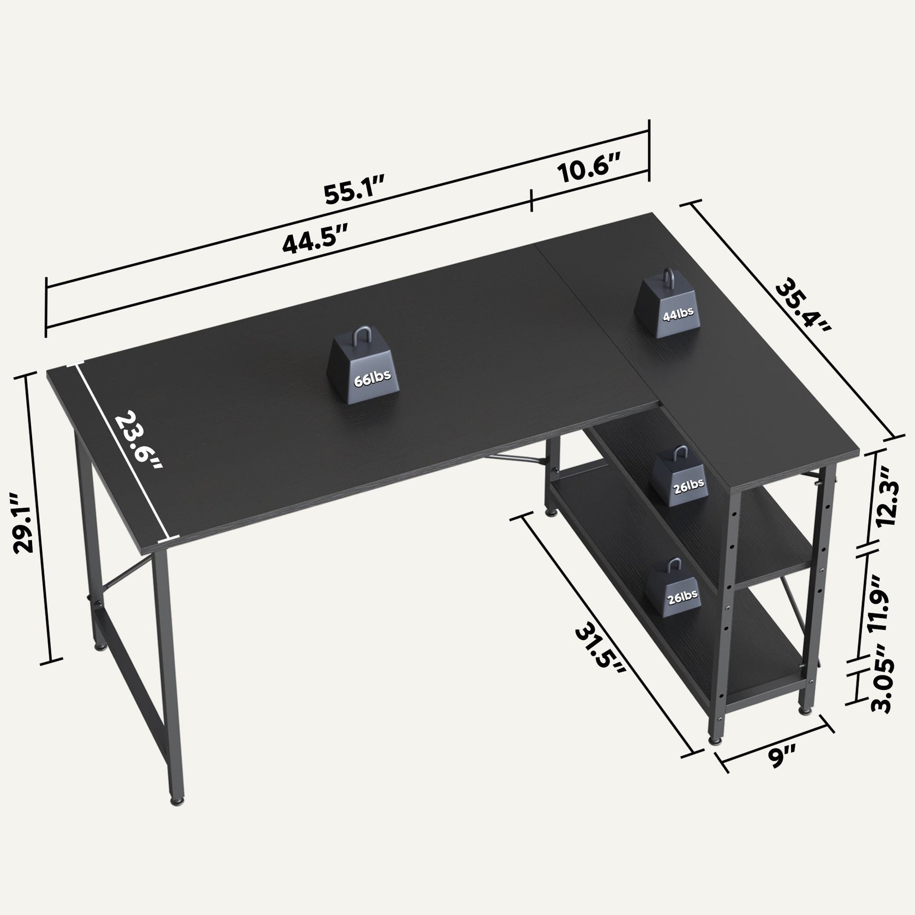 Modernisez votre bureau à domicile avec notre petit bureau d'angle en L avec étagères de rangement. Doté d'un design unique en L et d'un plateau de 140 cm, ce bureau offre plus d'espace pour vos dossiers et livres, tout en apportant une touche de dynamisme à votre espace de travail. Ses étagères de rangement réversibles s'installent à gauche comme à droite selon vos préférences, et leur hauteur est réglable. Le montage est un jeu d'enfant grâce à des instructions claires et des accessoires bien organisés. Vous bénéficierez d'une tranquillité d'esprit grâce à notre politique de retour de 30 jours et à notre service client à vie. Nous disposons d'une plaque d'immatriculation certifiée et d'un test de charge professionnel. La photo est une photo réelle de l'acheteur, autorisé à l'afficher (la photo réelle du client mesure 119 cm).