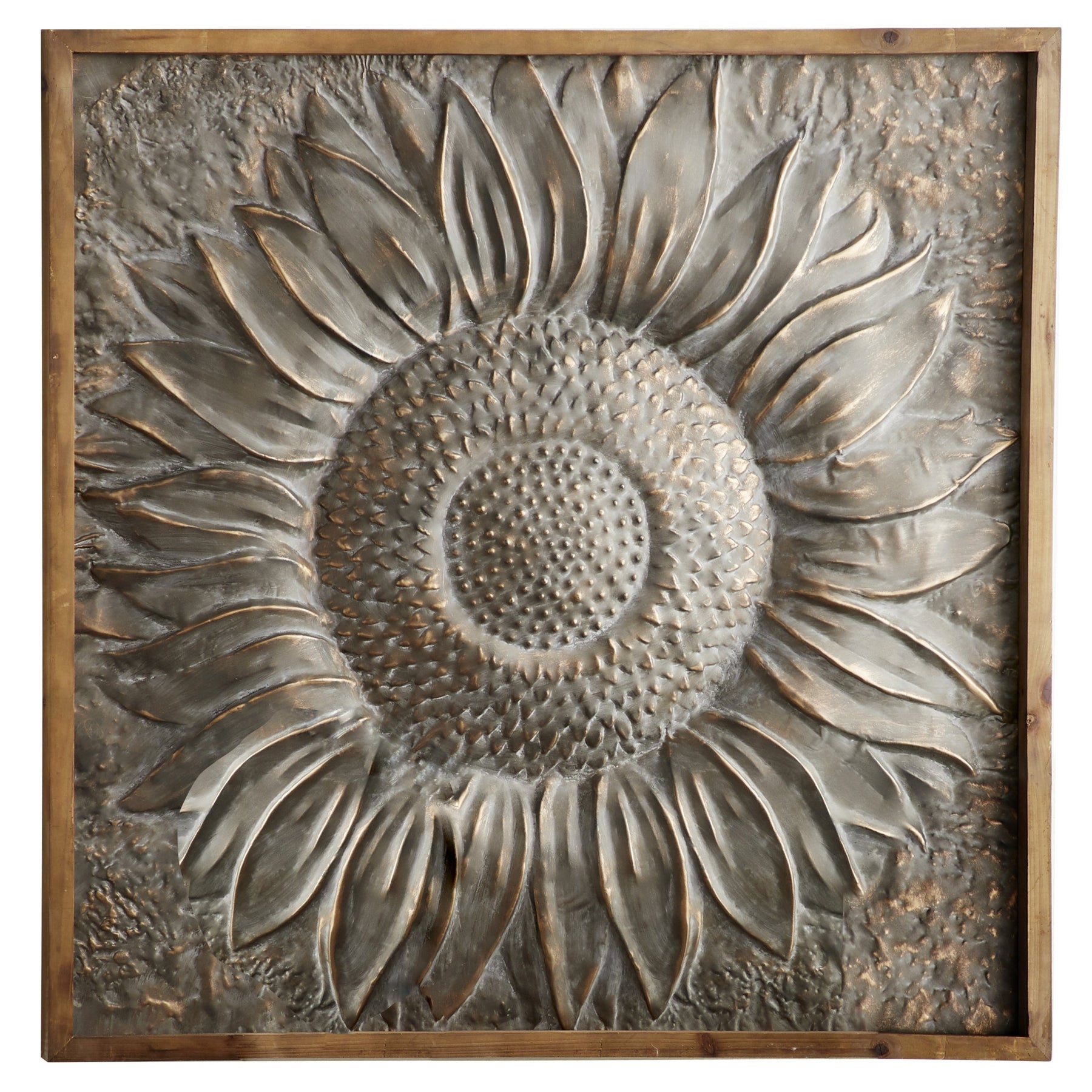 • Le décor carré pour mur présente une finition gris satiné saisissante, avec son tournesol en métal argenté foncé mis en valeur par des coups de pinceau dorés métalliques et un cadre marron