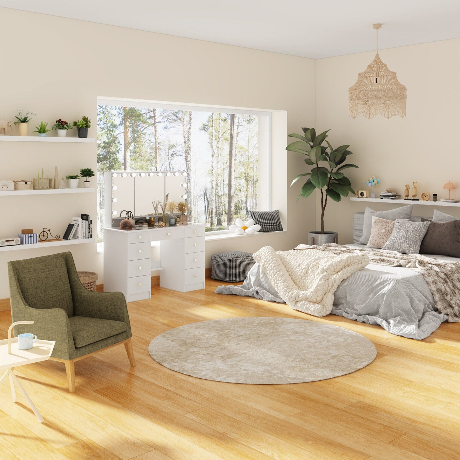 ☆ Rangement généreux : la vanité offre un grand espace de rangement pour les cosmétiques, les bijoux et les articles personnels, gardant vos essentiels de beauté organisés.
