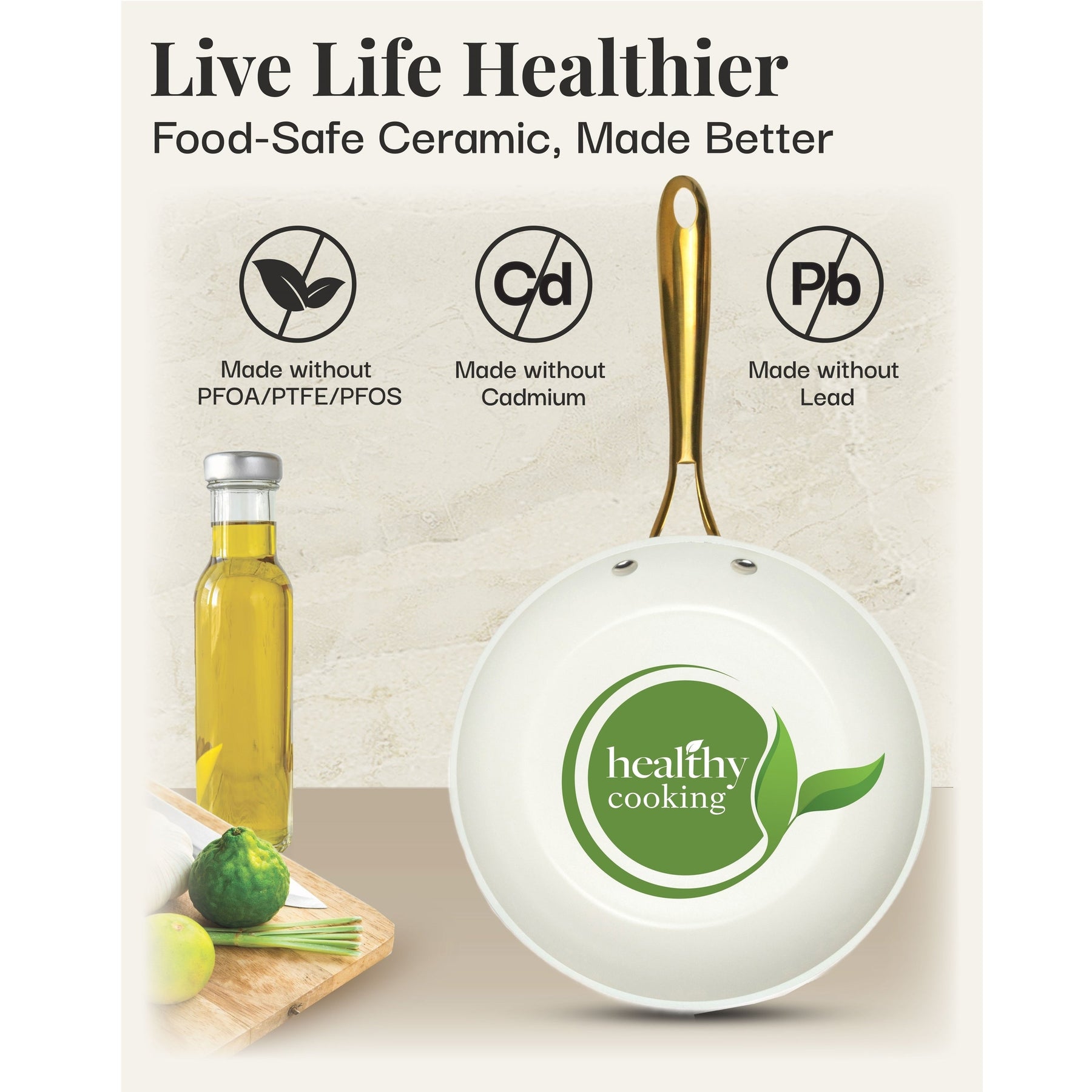 • Ensemble de 10 casseroles et poêles antiadhésives en céramique comprenant : une poêle de 8,5 pi, une poêle à frire de 10,25 pi avec couvercle en verre trempé, une casserole de 1,5 pinte avec couvercle en verre trempé, une casserole de 2,5 pintes avec couvercle en verre trempé, une marmite de 5 pintes avec couvercle en verre trempé, un insert vapeur en acier inoxydable pour marmite.