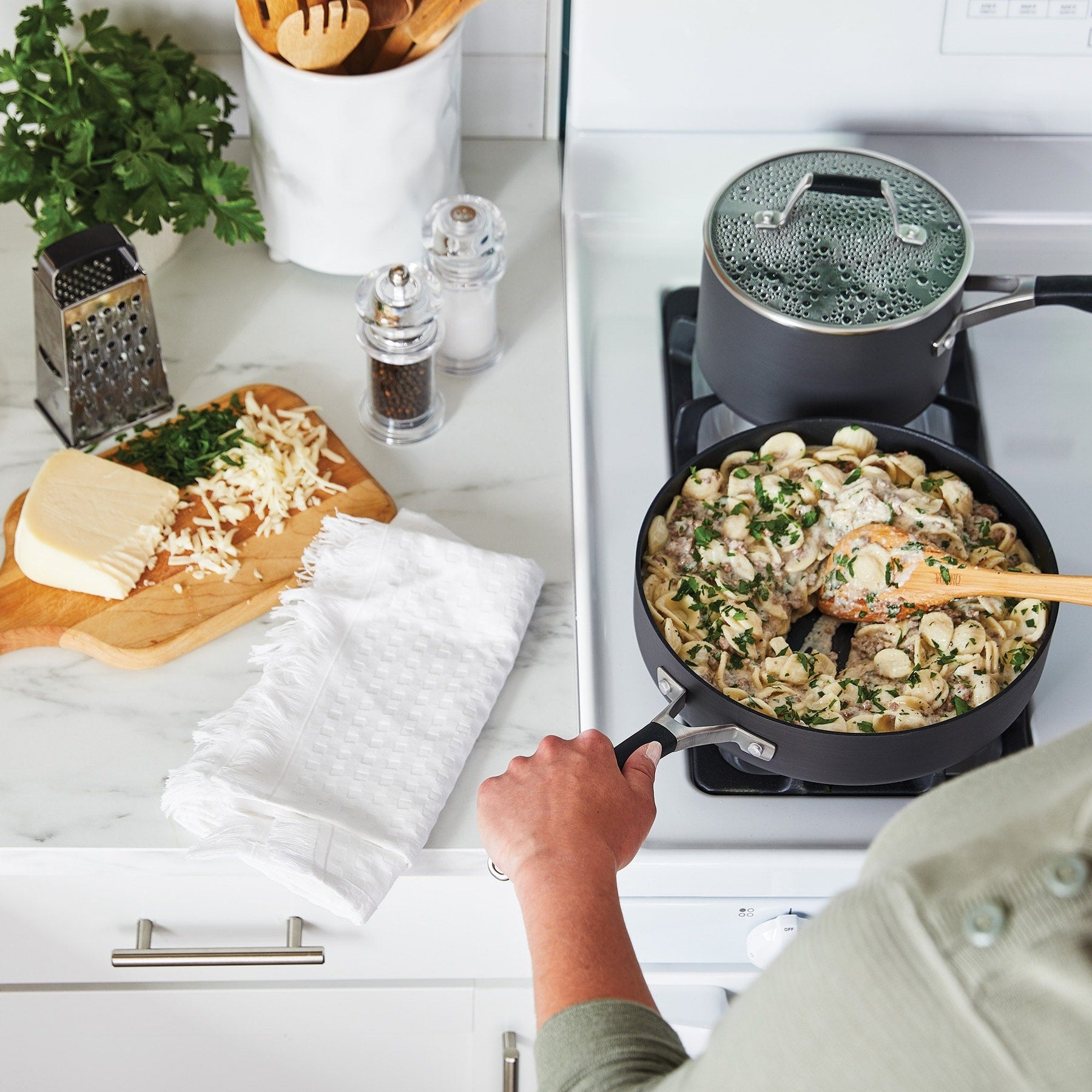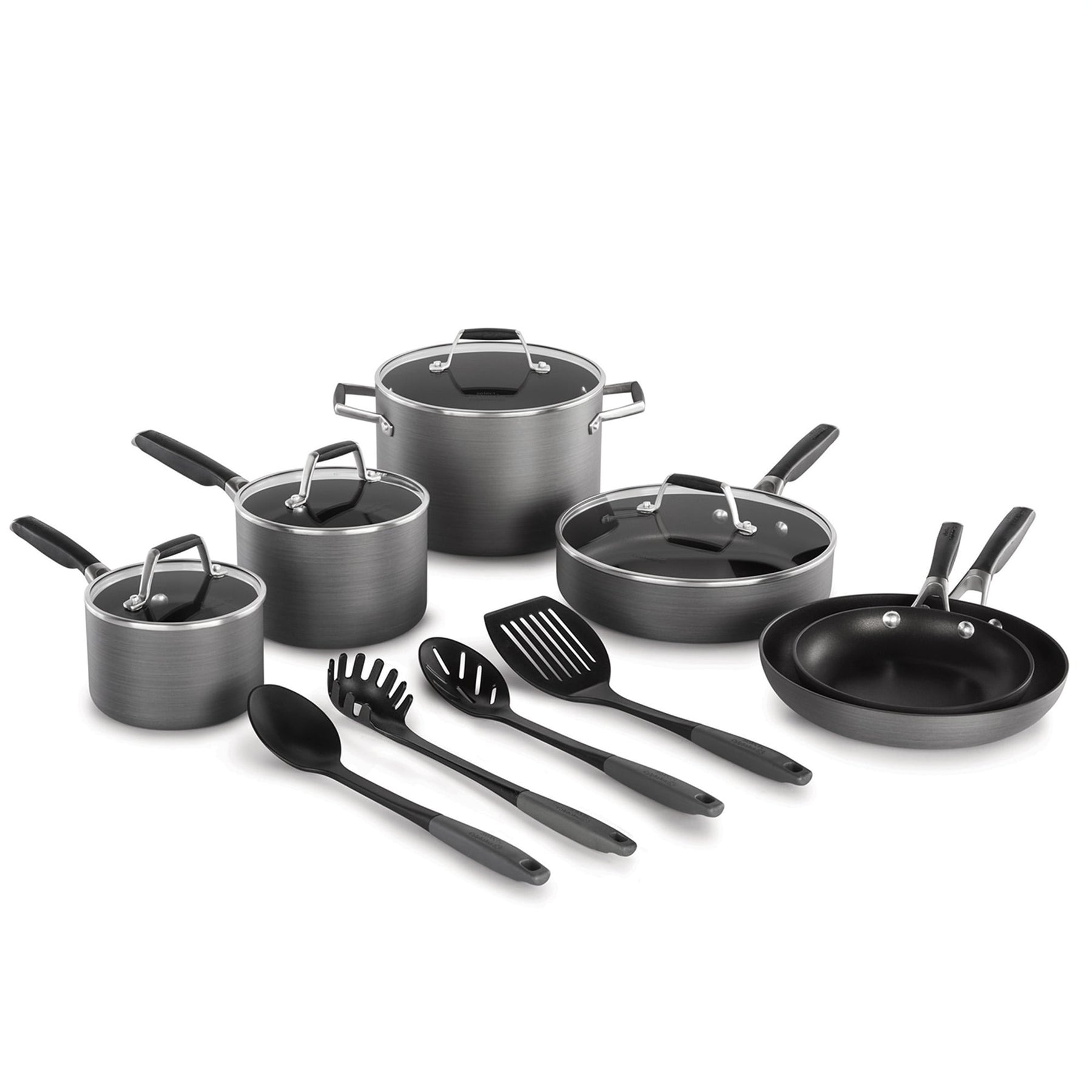 Un ajout essentiel à toute cuisine, les ustensiles de cuisine antiadhésifs anodisés durs Select de Calphalon vous aident à cuisiner plus facilement grâce à leur surface améliorée* à dégagement facile. Dotée de la technologie antiadhésive AquaShield, cette gamme d'ustensiles de cuisine fonctionne comme neuve 40 % plus longtemps* pour un démoulage remarquable des aliments, encore et encore. ・La technologie antiadhésive AquaShield à base d'eau permet aux poêles de fonctionner comme neuves 40 % plus longtemps (par rapport à la génération précédente de Select by Calphalon) ・Va au lave-vaisselle pour un nettoyage facile ・Le long manche en silicone reste froid sur la cuisinière ・Va au four jusqu'à 200 °C, vous permettant ainsi de passer facilement de la cuisinière au four ・Couvercle en verre trempé ・L'ensemble comprend : une poêle à frire de 20 cm, une poêle à frire de 25 cm, une casserole de 1,5 l avec couvercle, une casserole de 2,5 l avec couvercle, une sauteuse de 3 l avec couvercle, une marmite de 6 l avec couvercle, une cuillère pleine, une écumoire, une fourchette à pâtes et une spatule ajourée ・Compatible avec la plupart des cuisinières, y compris les cuisinières à gaz, électriques et en verre ・Garantie limitée de 10 ans