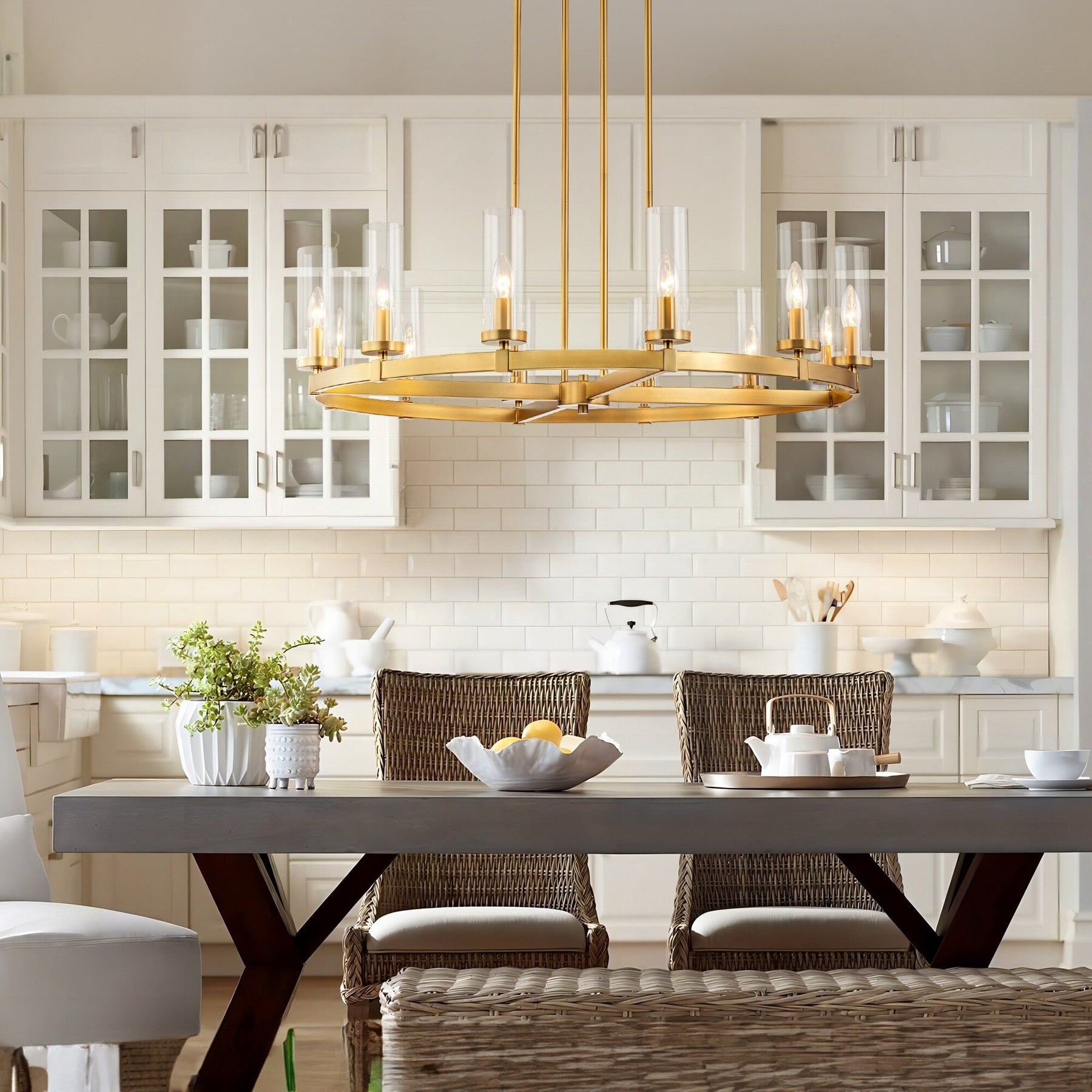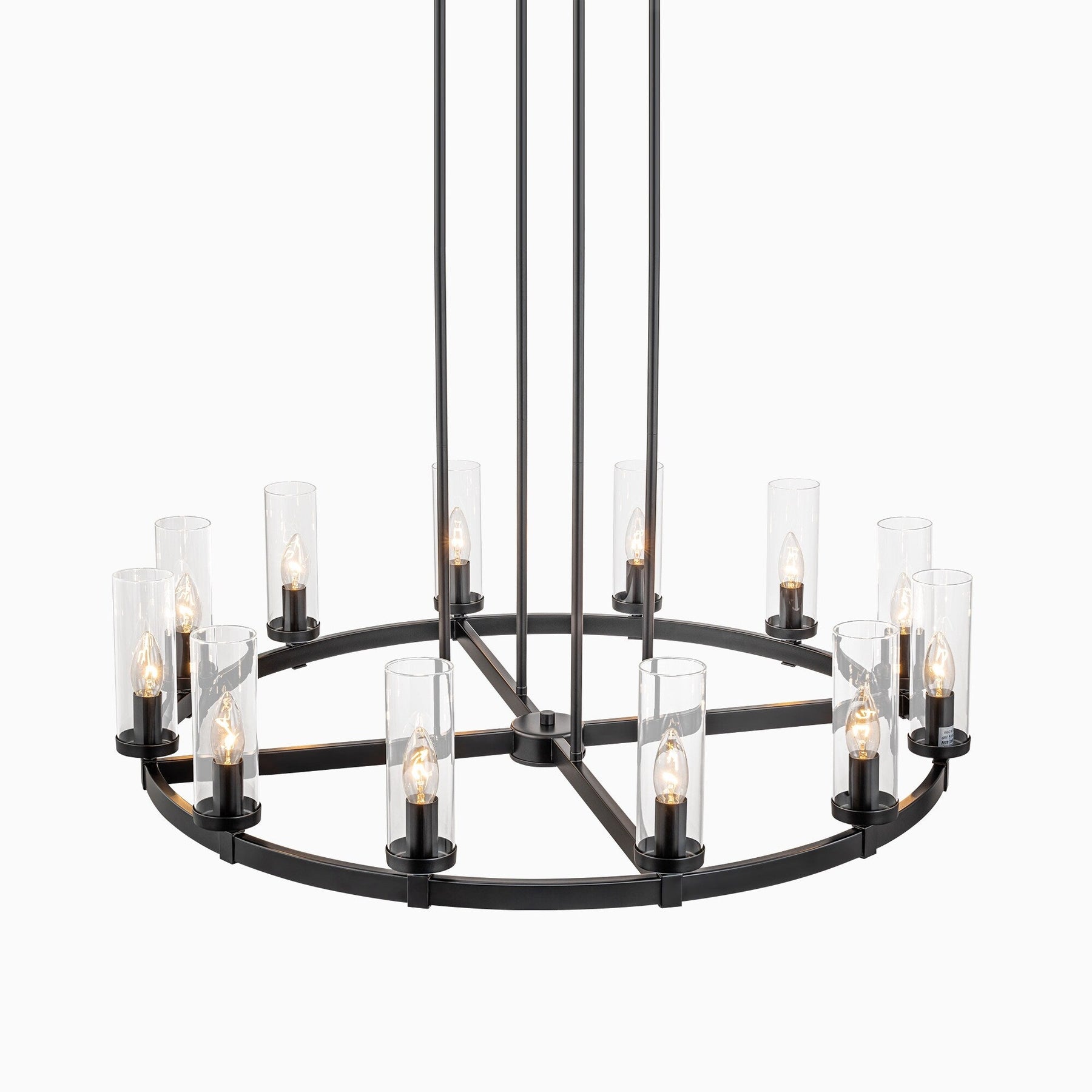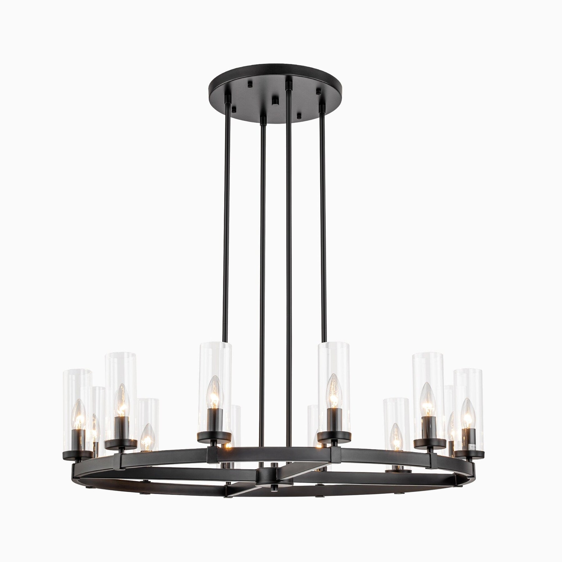 Ce lustre rétro industriel circulaire en forme de roue de chariot à 12 lumières, en verre transparent, d'un diamètre de 90 cm, témoigne d'un savoir-faire artisanal et d'une ingéniosité de conception inégalés. La lumière traverse l'abat-jour en verre transparent et diffuse une lumière douce et généreuse, projetant une aura lumineuse qui enveloppe gracieusement votre espace de vie. Ce luminaire opulent présente un cadre distinctif en forme de roue et d'élégantes ampoules cylindriques de style chandelier (non fournies), dégageant une présence imposante et une esthétique industrielle vintage prononcée.