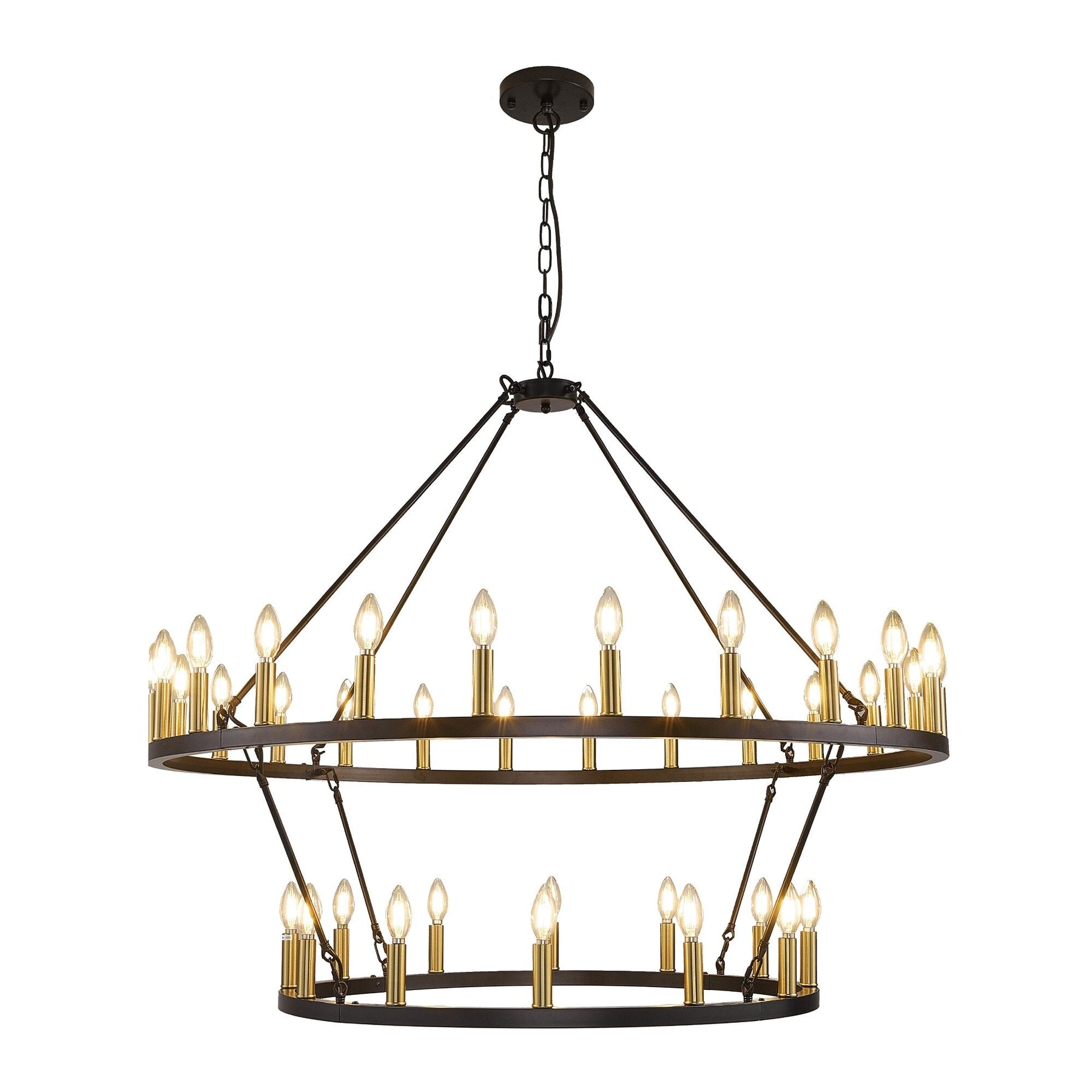 Ajoutez une touche de style campagnard moderne à votre intérieur avec ce grand lustre rond à deux niveaux en forme de roue de chariot. Fabriqué en fer de haute qualité, ce lustre classique est sablé pour une finition mate et durable. Ses 36 lumières réparties sur deux niveaux offrent une couverture lumineuse à 360° et créent une atmosphère chaleureuse. Ce grand lustre est parfait pour éclairer pleinement un grand espace comme un salon, une salle à manger ou un grand hall d'entrée à deux étages.