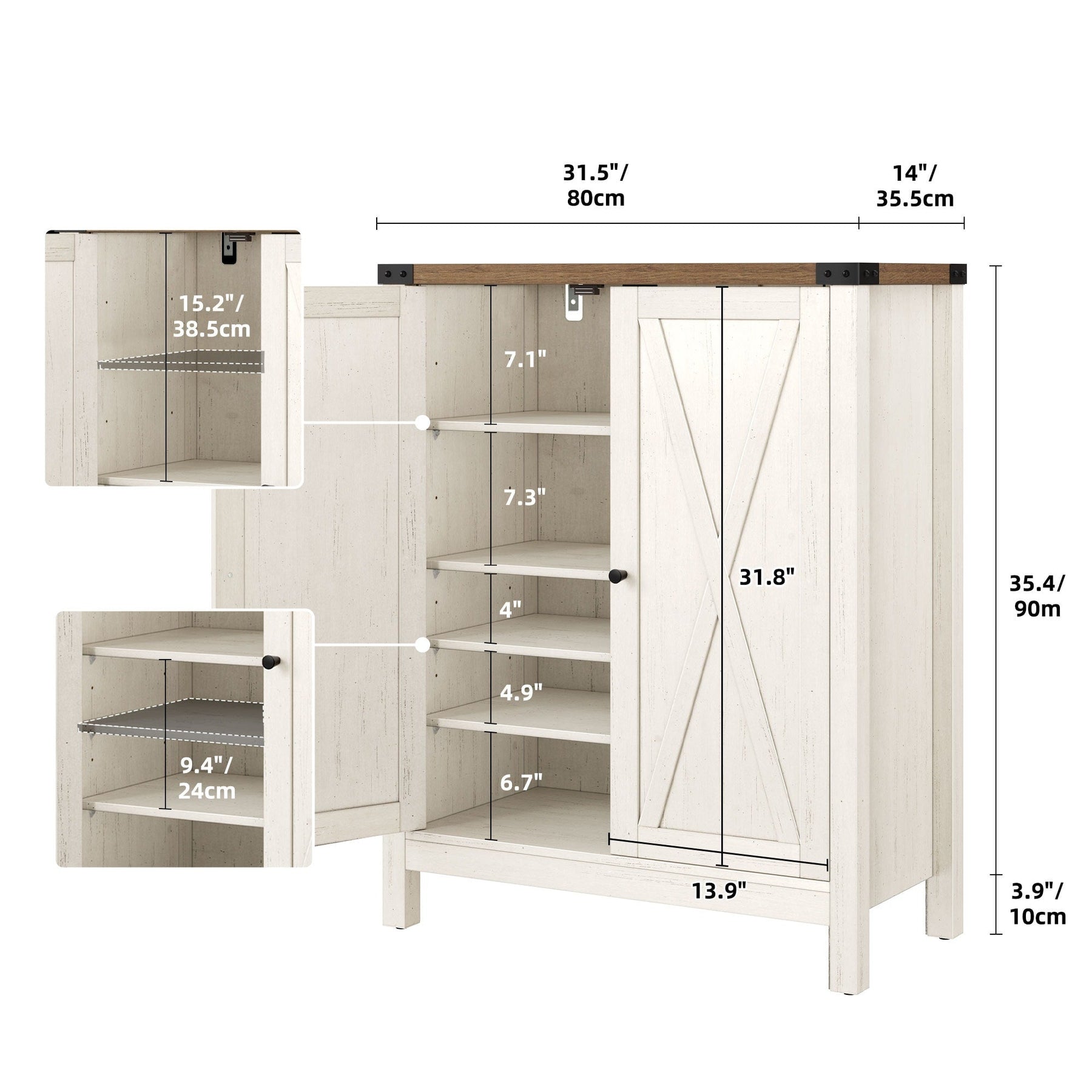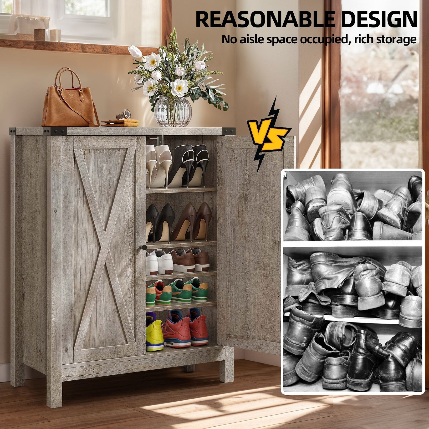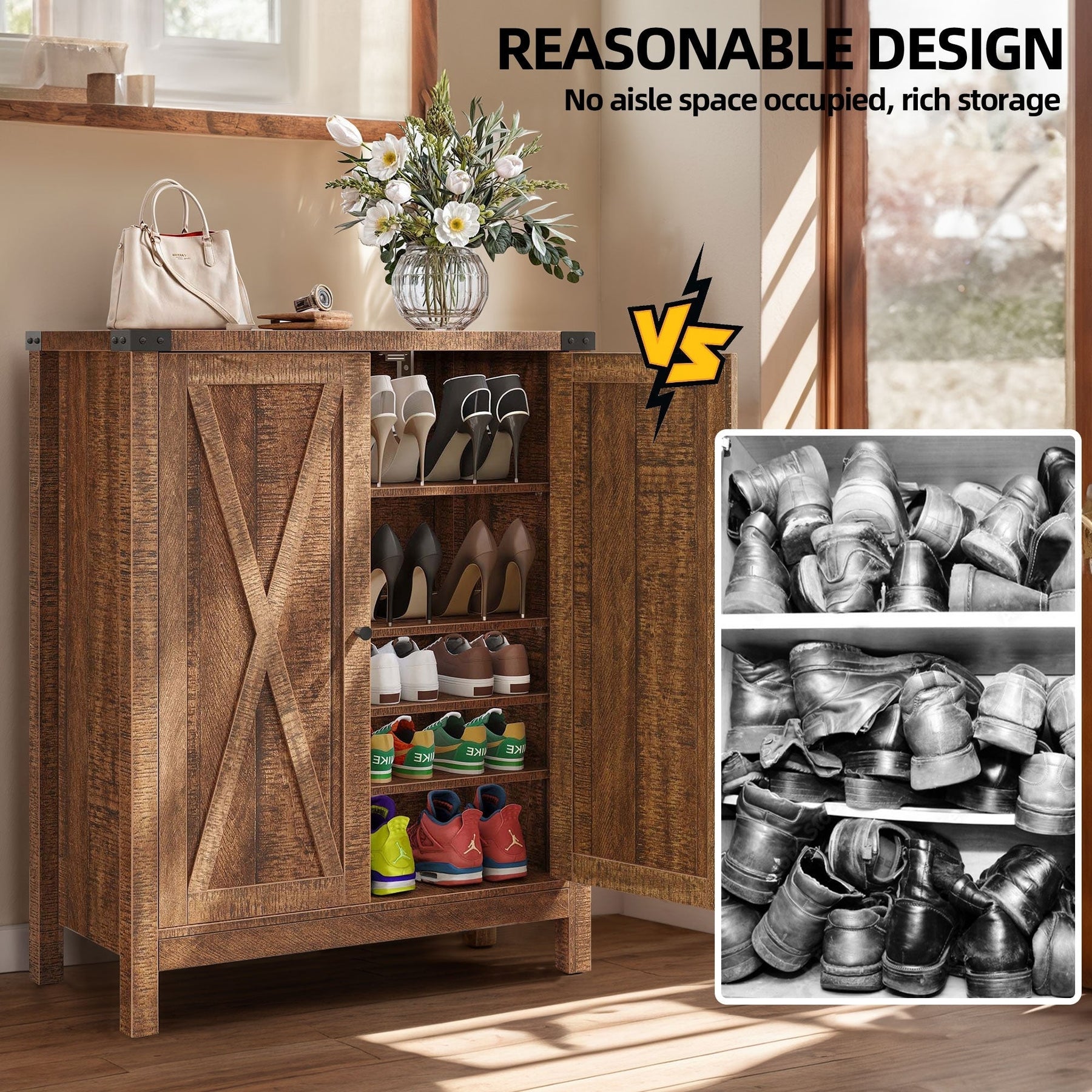 Organisez votre espace avec notre spacieux meuble à chaussures. Avec ses 5 étagères pouvant accueillir 15 à 20 paires de chaussures et son plateau pratique pour les petits objets, il est indispensable à toute maison. Son élégant motif en X lui confère un charme rustique, tandis que ses 1re et 3e étagères réglables accueillent tous types de chaussures. Fabriqué en MDF durable avec des pieds en bois robustes, il est conçu pour une stabilité et une longévité accrues. N'oubliez pas d'installer le kit anti-basculement inclus pour plus de sécurité.