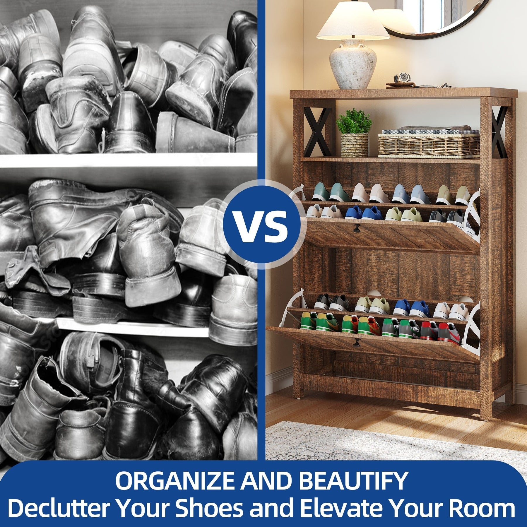 Les tiroirs à chaussures rabattables peuvent accueillir de 12 à 16 paires, les protégeant ainsi de la poussière et du désordre.