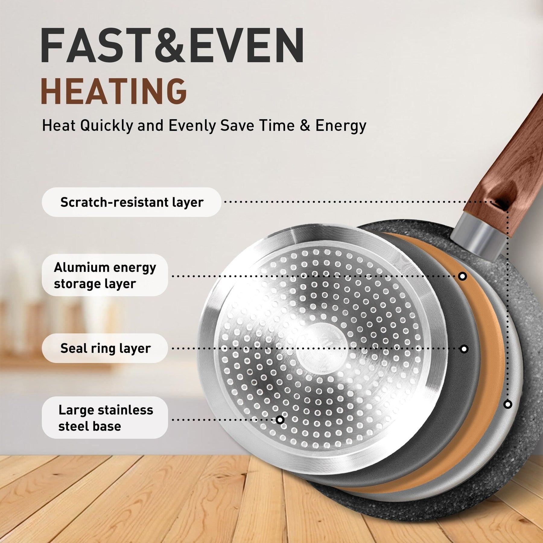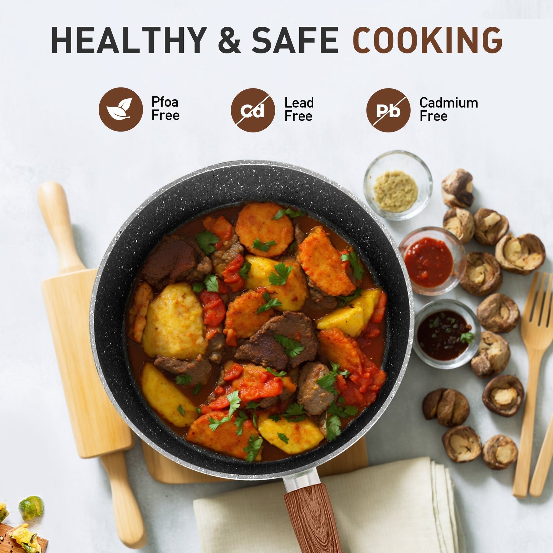 Batterie de cuisine antiadhésive : Lors de l'achat d'ustensiles de cuisine, l'un des critères les plus importants est la qualité antiadhésive. Le revêtement en granit empêche efficacement les aliments d'attacher. De plus, vous pourrez cuisiner des repas plus sains pour votre famille, car vous utiliserez moins d'huile. Vous pouvez cuire de la sauce tomate en toute sécurité dans des ustensiles de cuisine en granit ; le goût et l'odeur de vos aliments ne seront pas altérés, même avec des ingrédients acides ou à forte odeur.