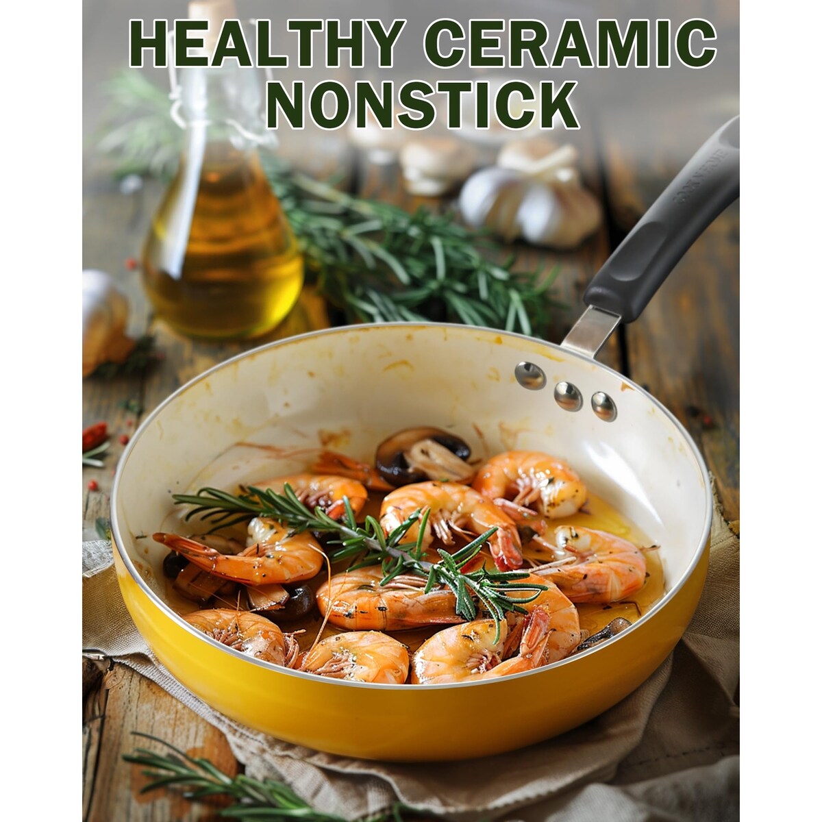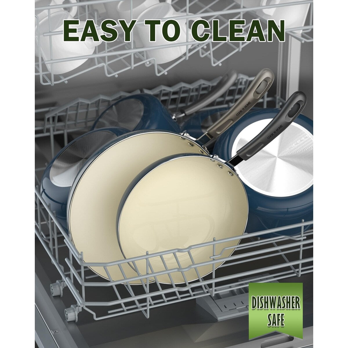 ENSEMBLE DE CUISINE - Ensemble de casseroles et poêles antiadhésives, noires comprenant des casseroles de 1 pinte et 2 pintes avec couvercles, une cocotte de 3 pintes avec couvercle, un faitout de 5 pintes avec couvercle, des poêles à frire de 8 pouces et 10 pouces pour tous vos besoins de cuisine. SÉCURITÉ ET CONFORT - Les ustensiles de cuisine sont fabriqués en aluminium épais pour une excellente conduction thermique et une cuisson uniforme. Les poignées rivetées en acier inoxydable et plastique assurent une prise en main sûre et restent froides. Les poignées perforées permettent une suspension facile. FACILE À NETTOYER - Le revêtement antiadhésif de l'ensemble de cuisson est facile à nettoyer, consomme moins d'huile et les aliments n'attachent pas au fond de la poêle, pour une cuisson plus saine. Attention : n'utilisez pas d'ustensiles métalliques ni d'objets pointus pour rayer le revêtement. COUVERCLES TRANSPARENTS - L'ensemble de casseroles et poêles est équipé de couvercles en verre trempé et d'évents de vapeur qui permettent à la vapeur de s'échapper pour voir les aliments pendant la cuisson. FONCTIONNE SUR - Cet ensemble de cuisson antiadhésif est compatible avec les plaques de cuisson à gaz, électriques, vitrocéramiques et halogènes. Remarque : Ne convient pas aux plaques à induction. Compatible four jusqu'à 175 °C. Compatible lave-vaisselle. Ces ustensiles de cuisine s'adaptent à toutes les cuisines et répondent à tous vos besoins culinaires.