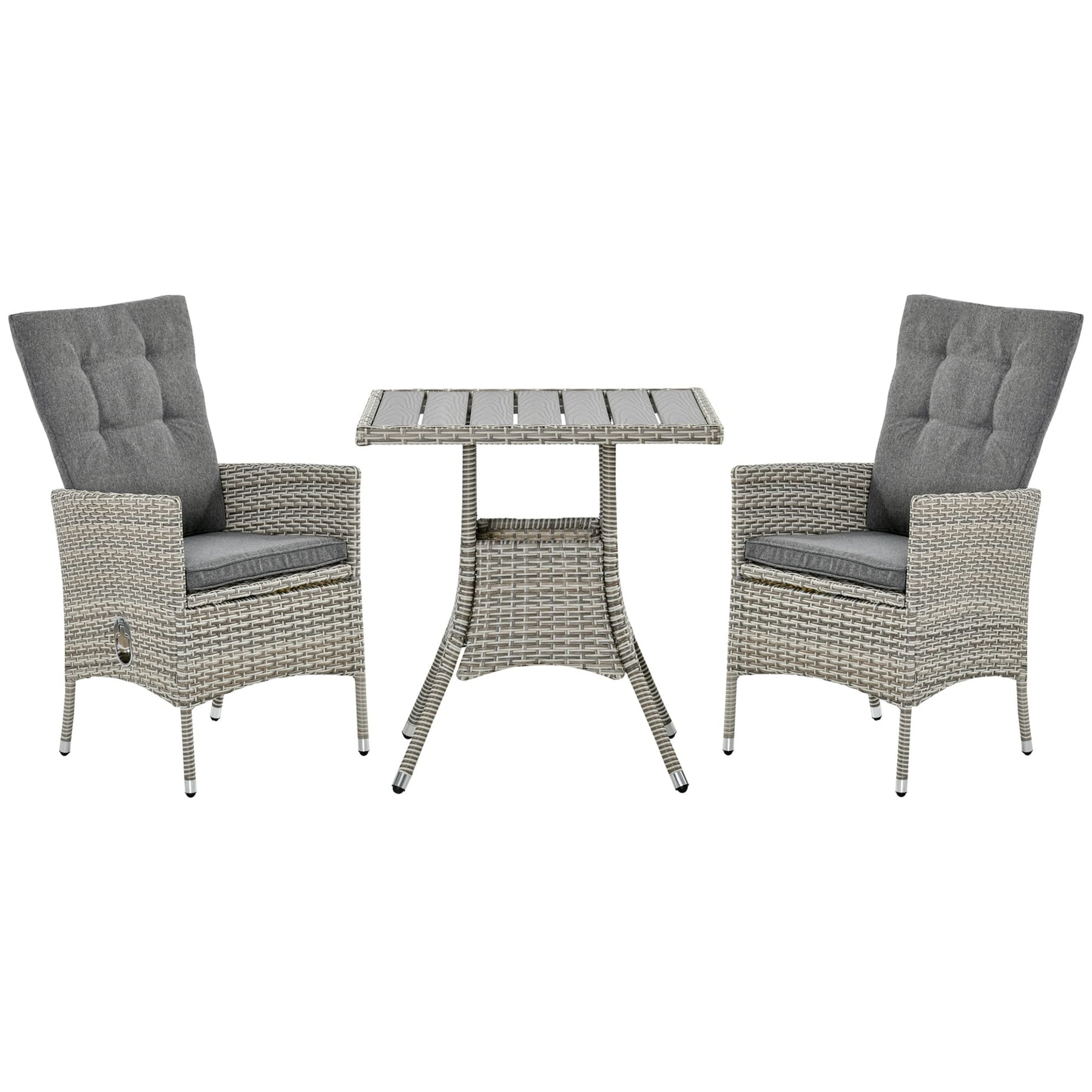 Profitez du confort de l'intérieur à l'extérieur avec Outsunny. Notre mobilier de jardin trois pièces comprend deux fauteuils inclinables en osier et une table basse d'extérieur. Installez-vous confortablement sur une assise au rembourrage épais et un dossier haut inclinable. La table basse arbore un élégant motif boisé disposé en lattes pour faciliter l'évacuation de l'eau après la pluie. Notre rotin synthétique présente le même style que l'osier classique, tissé à la main, avec une meilleure résistance à l'eau et aux intempéries. Sortez, installez-vous confortablement, optez pour Outsunny.