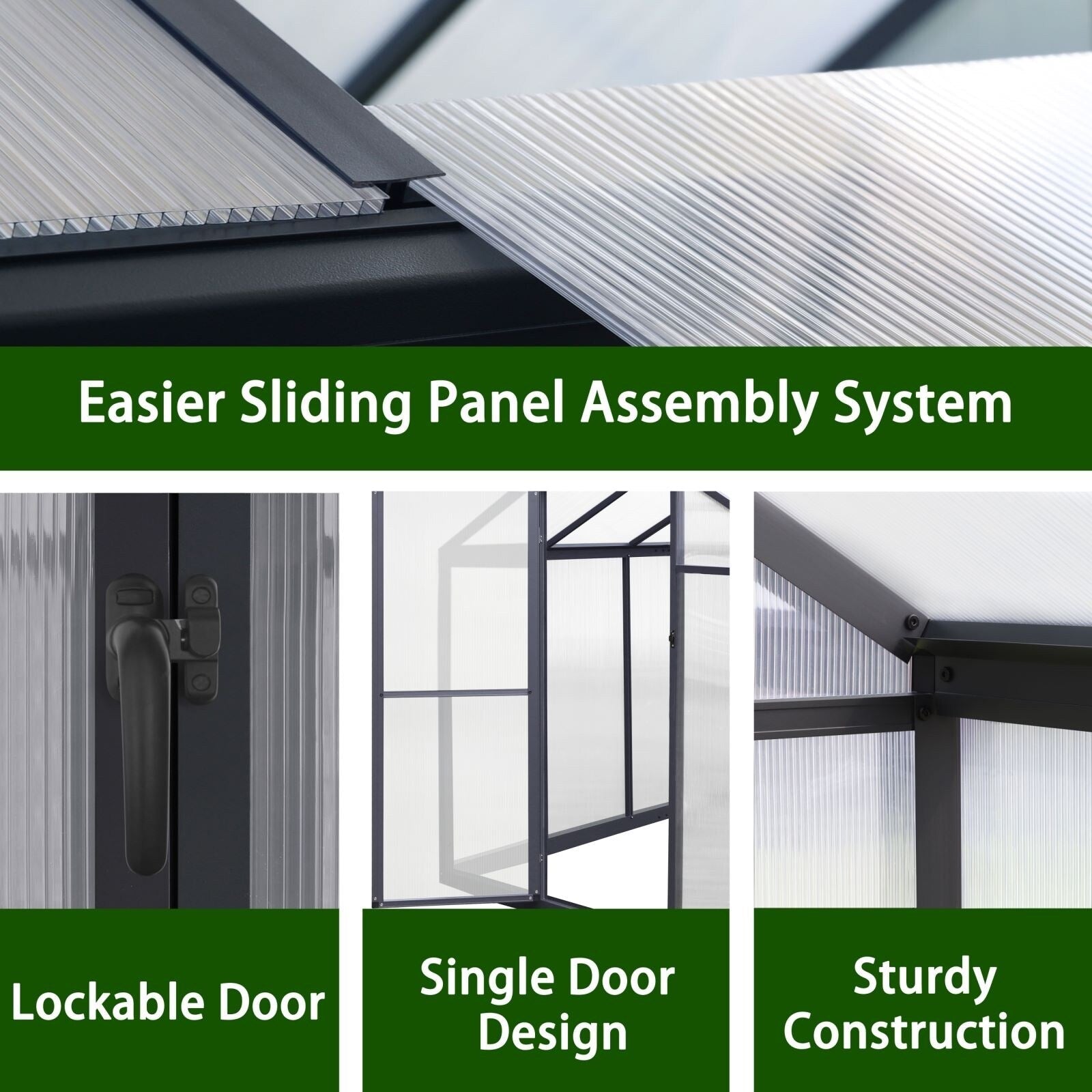 La serre en aluminium est équipée de plaques en polycarbonate résistantes aux UV qui protègent vos plantes des rayons UV nocifs et assurent leur croissance optimale. Grâce à ces caractéristiques, vos plantes prospèrent toute l'année, où qu'elles soient.