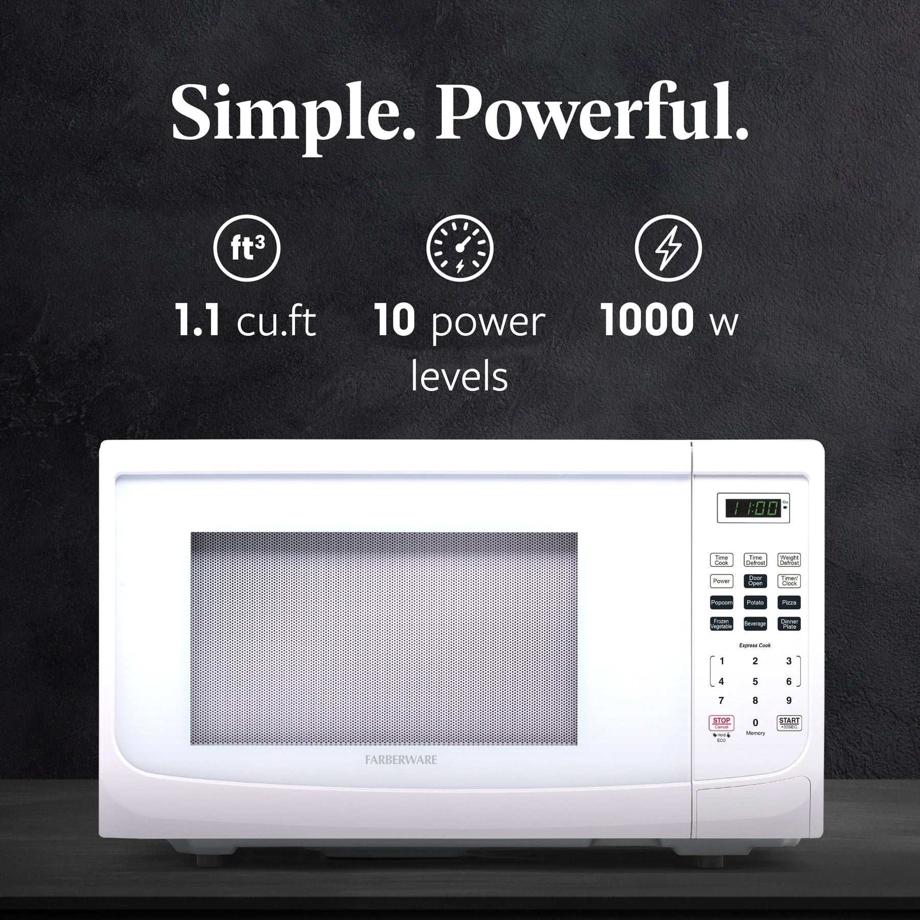 PRATIQUE : Le four à micro-ondes noir Farberware de 1,1 pi³ est la solution idéale pour la maison ou le bureau. Une cuisson de grande taille dans un espace compact.