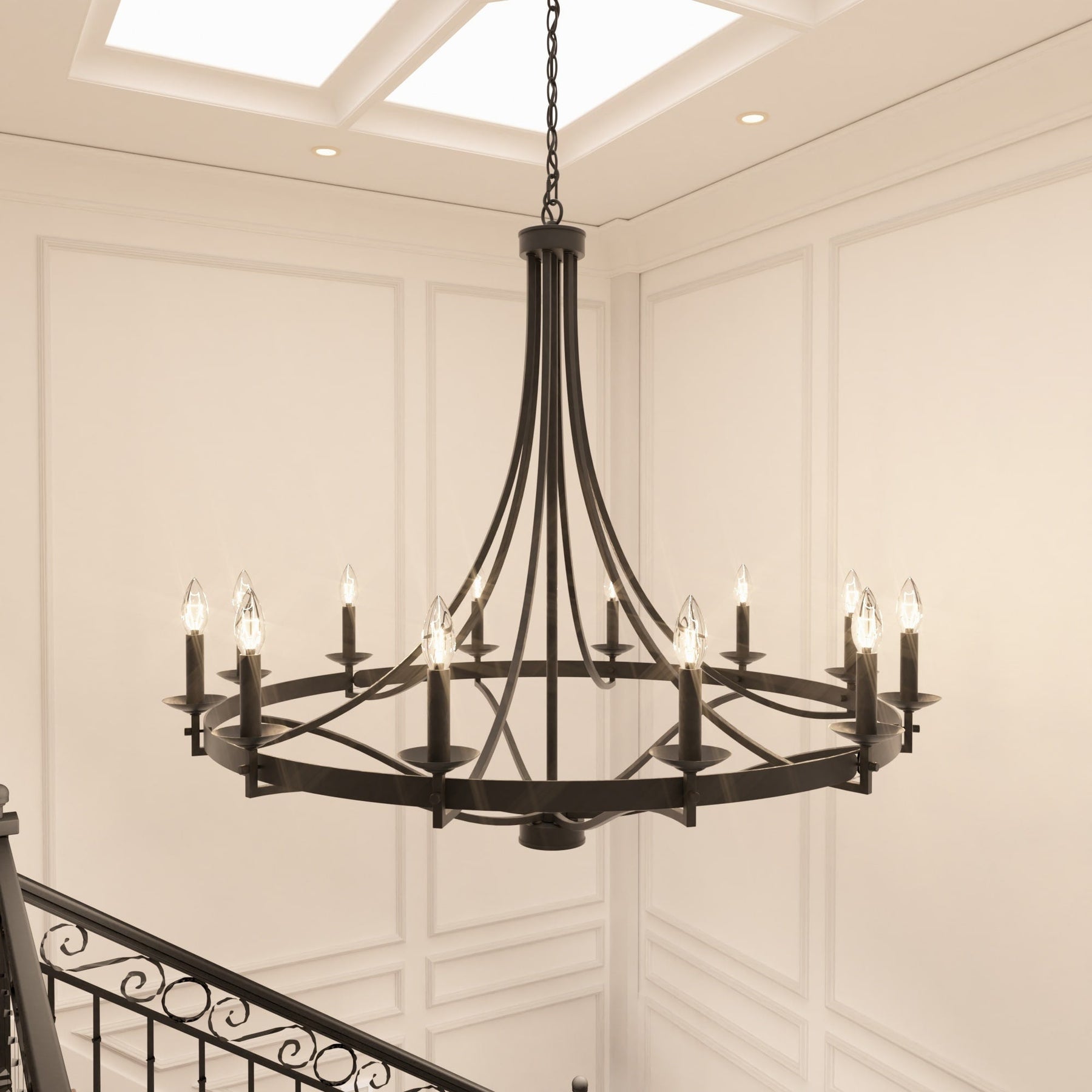 Lustre Empire à 12 lumières de style ferme moderne Fidenza avec roue de chariot et UL - D40'' * H135''