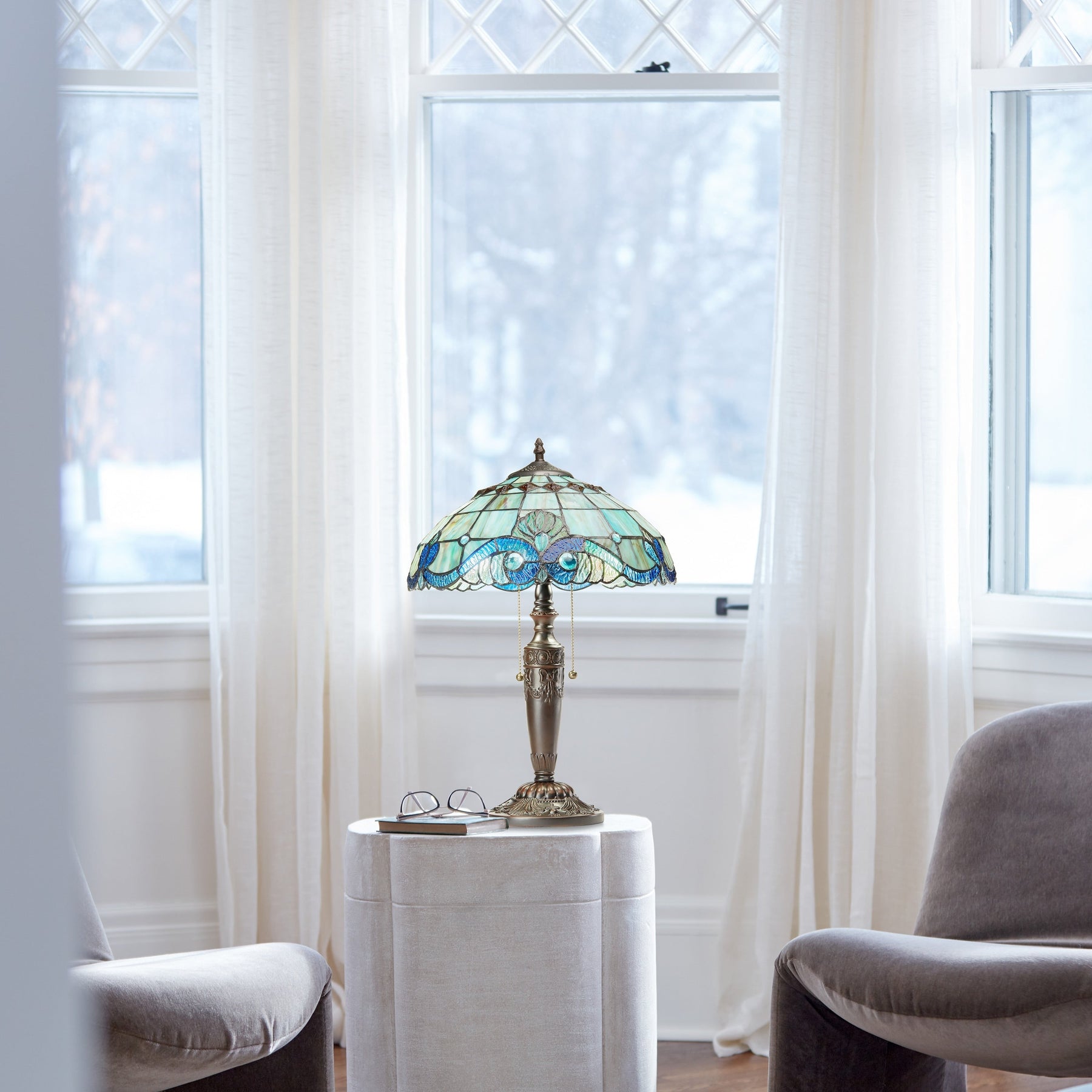 Ajoutez une touche d'élégance baroque à votre intérieur avec la lampe de table Asdreni de Gracewood Hollow. Véritable chef-d'œuvre, cette lampe de style Tiffany est composée de vitraux taillés à la main, enveloppés dans une feuille de cuivre, qui brillent magnifiquement lorsqu'elle est éclairée. Son pied en polyrésine ajoute à son charme, en faisant un ajout parfait à votre salon, chambre ou bureau.