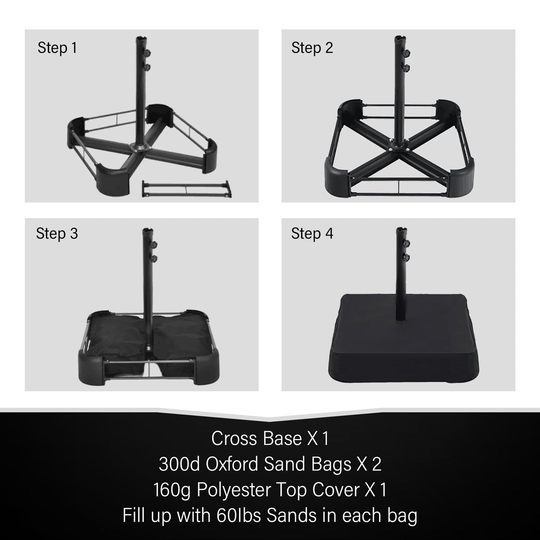 Base de parasol incluse pour une installation facile : Livré avec une base transversale robuste en acier, deux sacs de sable résistants en tissu Oxford 300D et une housse supérieure en polyester 180G. Nous recommandons d'utiliser 45 kg de sable par sac pour garantir la stabilité.