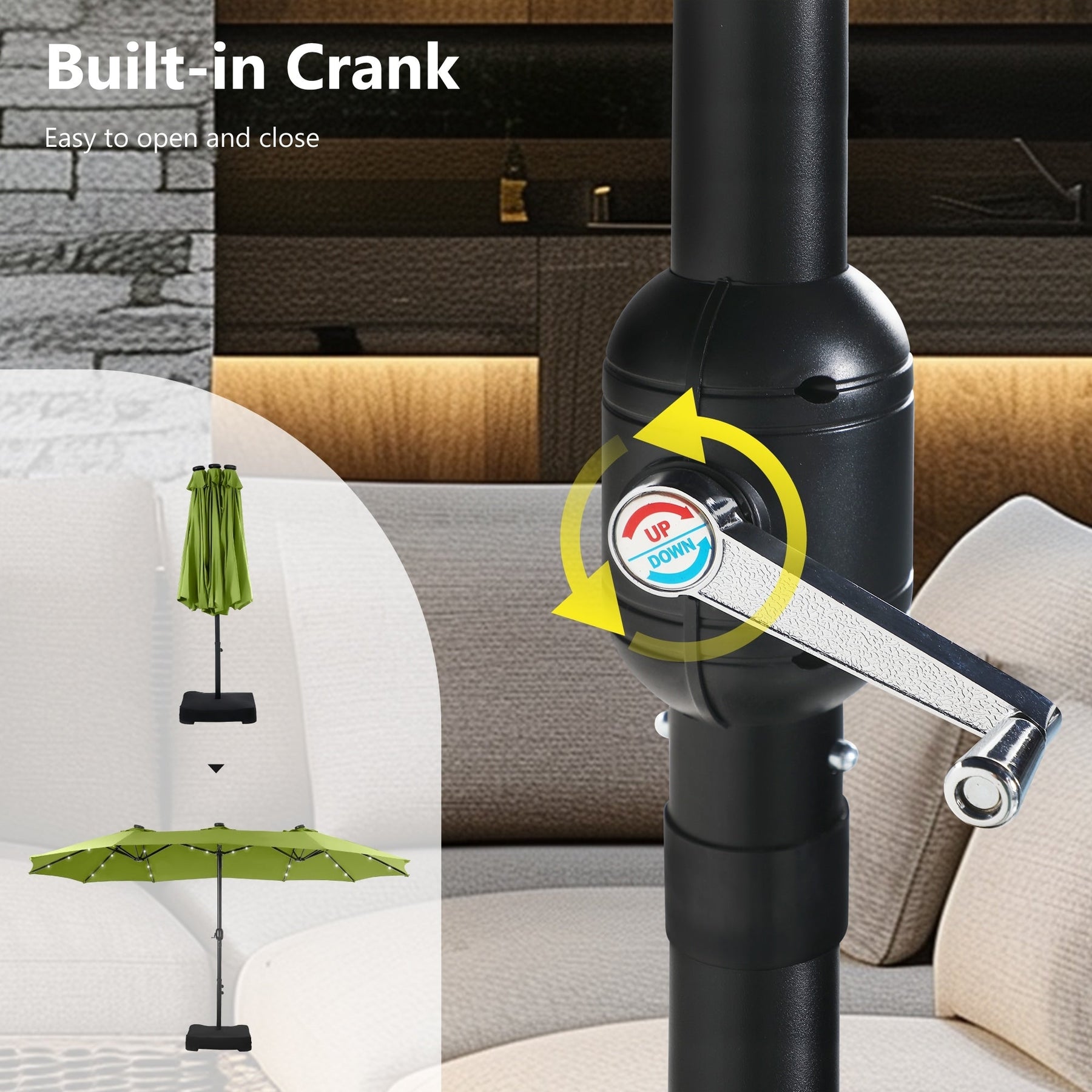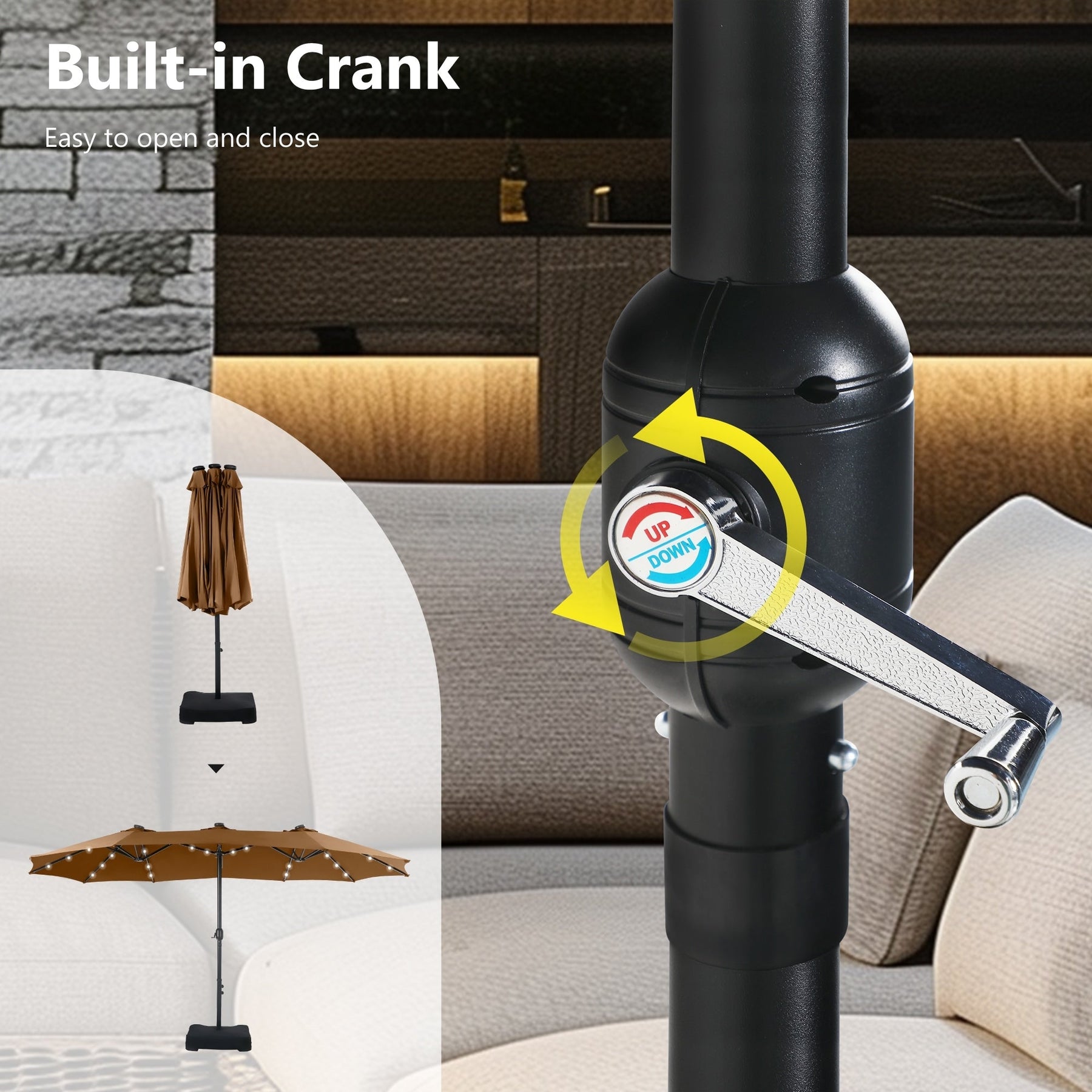 Conception robuste en acier : Doté de 12 baleines robustes et d'un mât central robuste (5,8 à 6,4 cm de diamètre), ce parasol de terrasse est conçu pour durer et résister à la rouille. Profitez d'une ombre fiable et d'une ouverture et d'une fermeture faciles grâce à son mécanisme à manivelle qui simplifie l'installation.