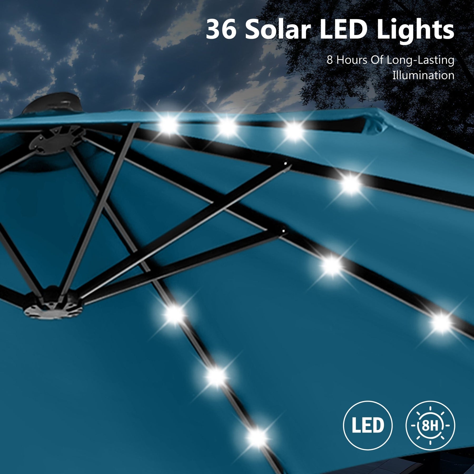 Éclairage LED pratique : Profitez de votre espace extérieur de jour comme de nuit grâce aux 36 LED réparties uniformément le long des baleines du parasol. Le panneau solaire vous permet d'économiser de l'énergie tout en bénéficiant d'un éclairage intense lorsque vous en avez besoin.