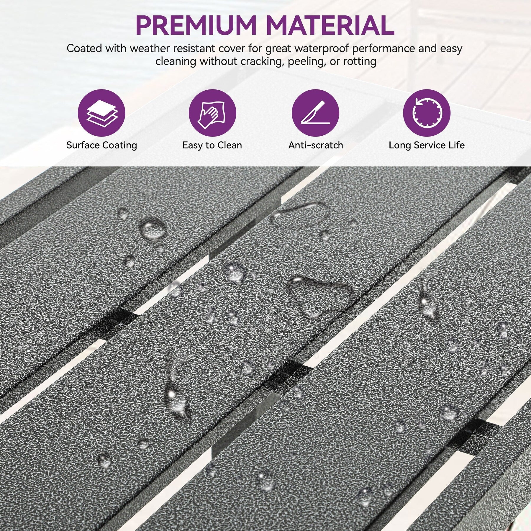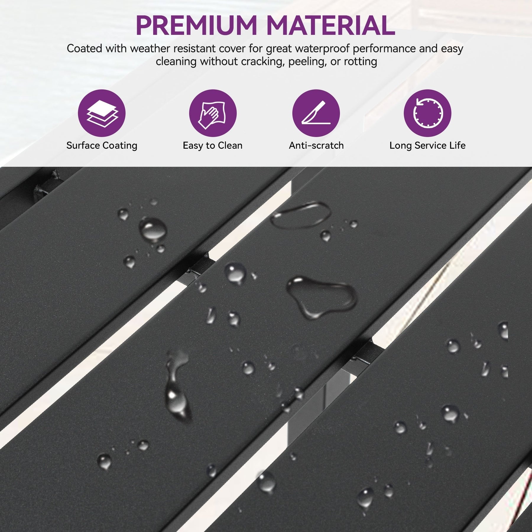 Facile à nettoyer : le plateau de la table est composé de lattes métalliques avec une finition élégante, permettant d'essuyer les taches sans effort avec un chiffon.