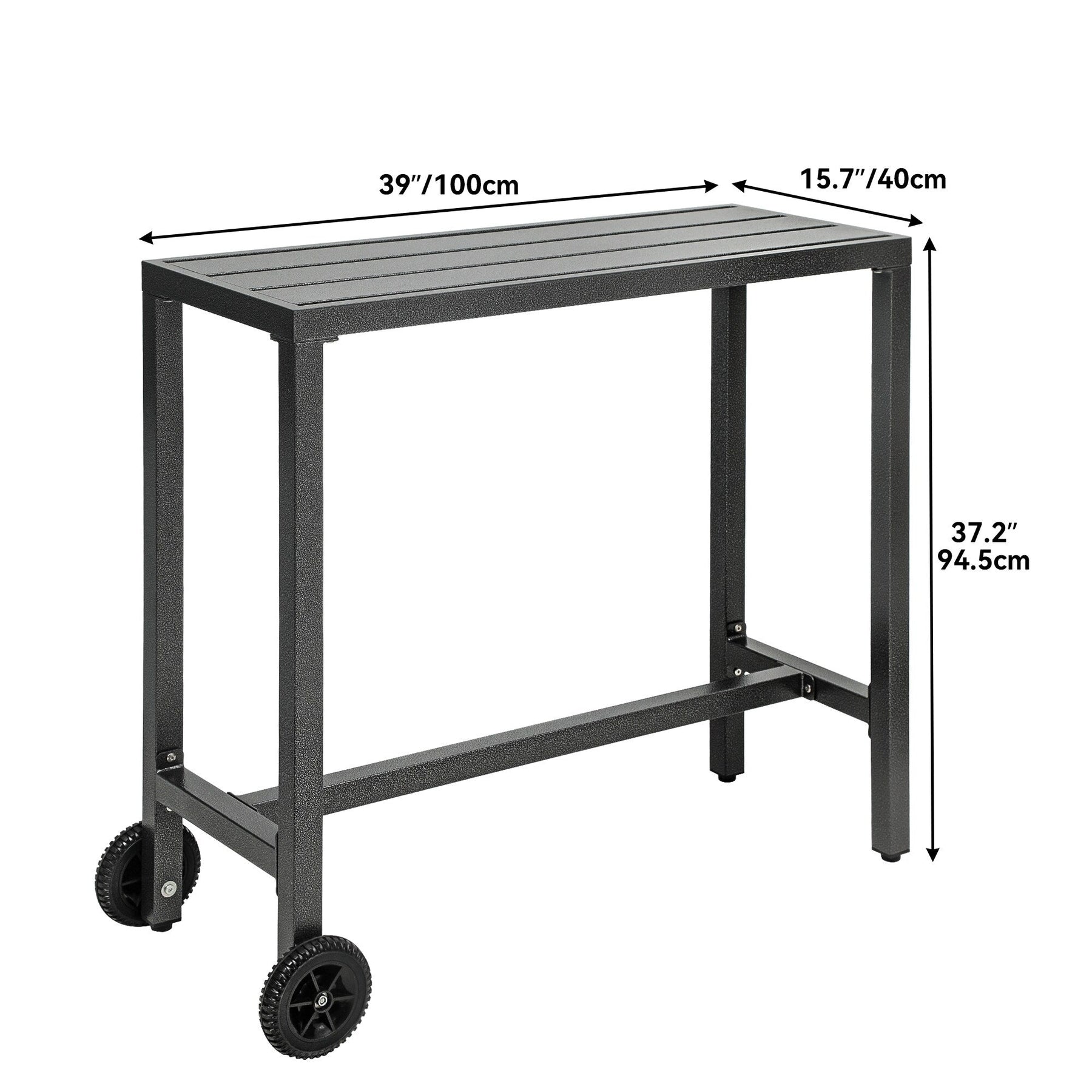 Notre table de bar d'extérieur est un ajout élégant et robuste à votre espace extérieur. Fabriquée en métal de haute qualité avec une finition thermolaquée, elle est durable et robuste. Sa capacité de charge de 120 kg lui permet de supporter sans effort de lourdes charges. De plus, ses roulettes latérales facilitent son déplacement et son repositionnement.