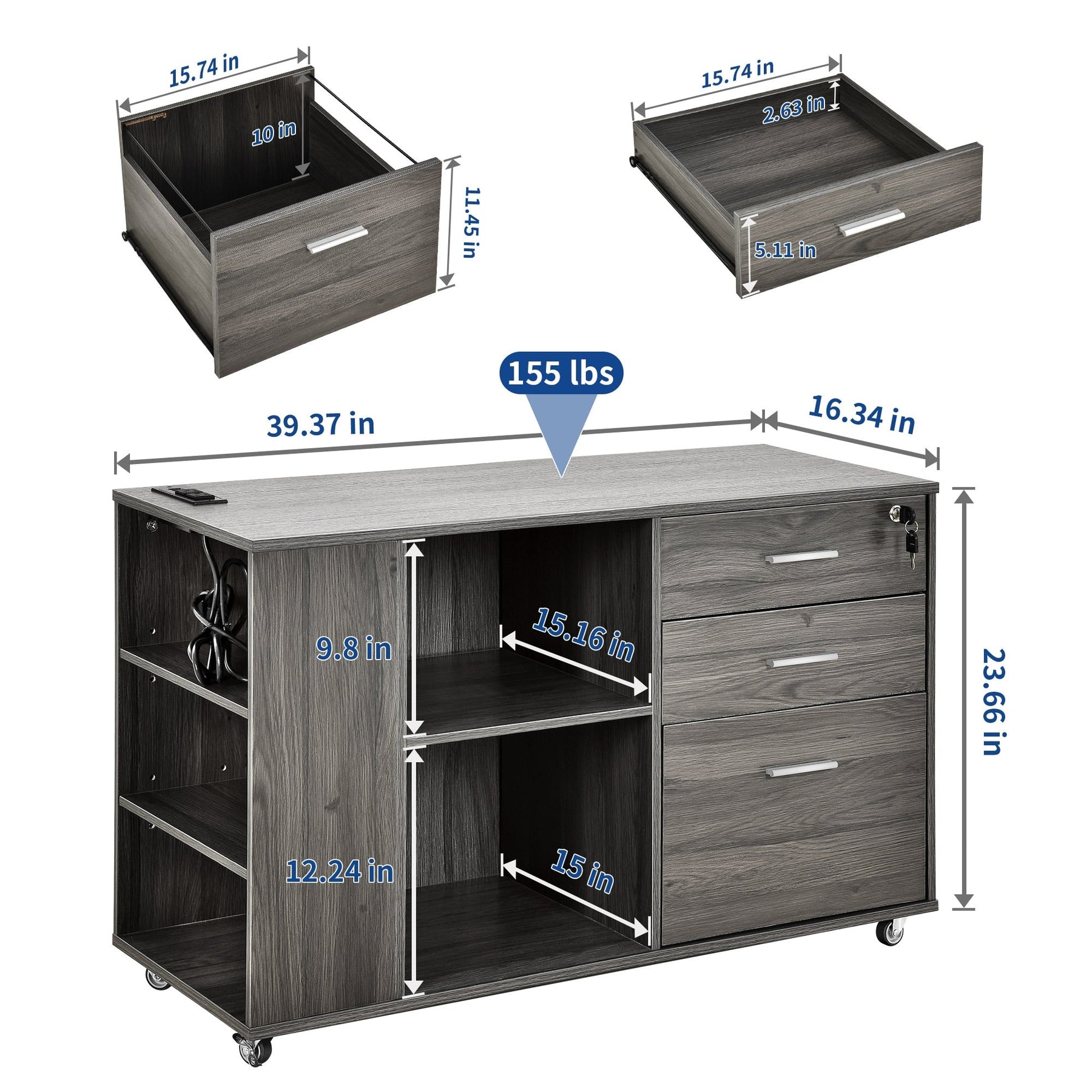 1. Chargez plusieurs appareils : Ce classeur en bois est doté de deux prises et de deux ports USB qui vous permettent d'alimenter facilement votre imprimante, lampe, téléphone, iPad, ordinateur portable et bien plus encore. Son cordon d'alimentation de 2 mètres vous offre une grande flexibilité pour le placer où vous le souhaitez.