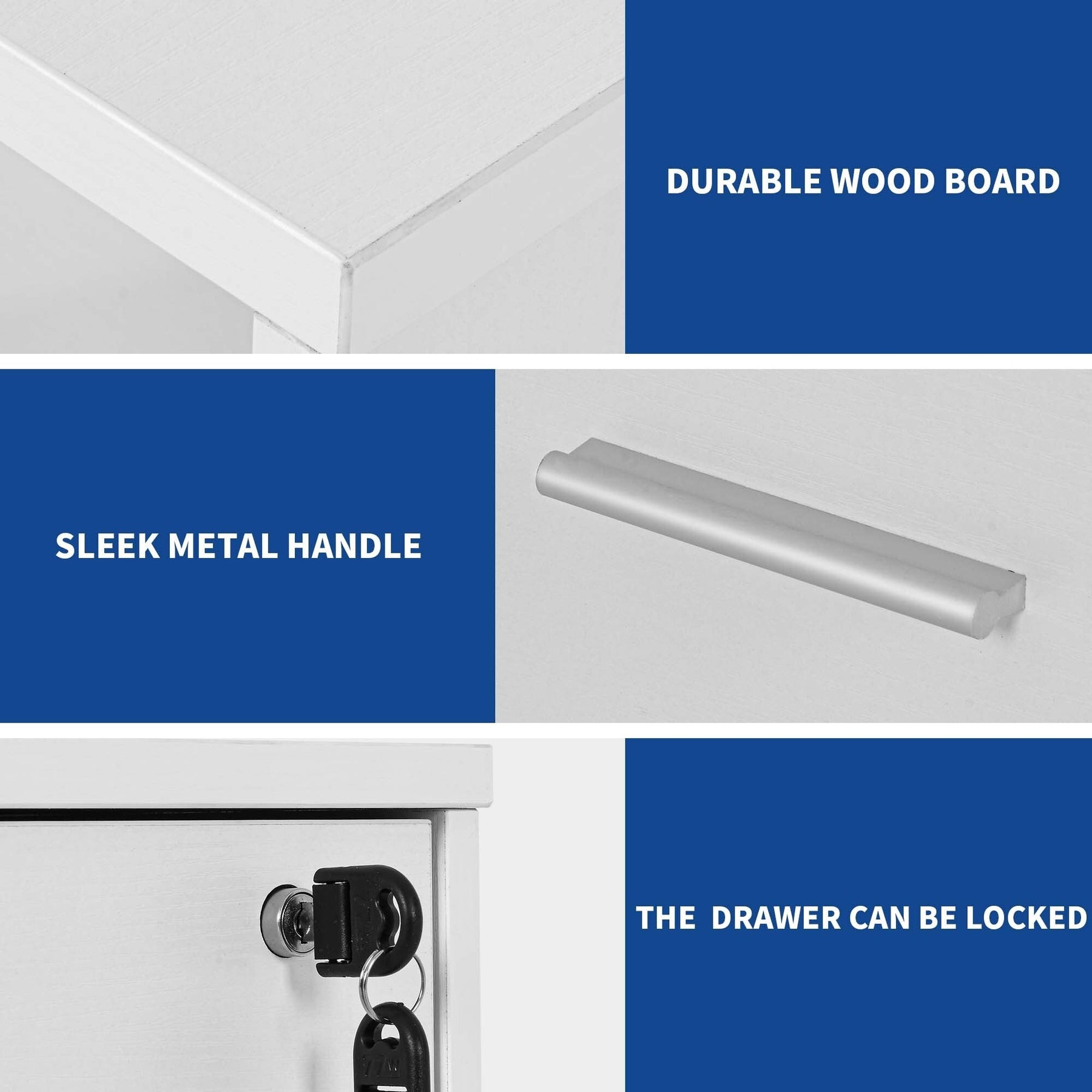 3. Protégez vos dossiers et objets de valeur : Le tiroir inférieur est doté de barres de suspension permettant de ranger des dossiers de formats A4, Lettre et Légal de manière organisée. Le tiroir supérieur est muni d'une serrure qui protège vos effets personnels contre tout accès non autorisé.