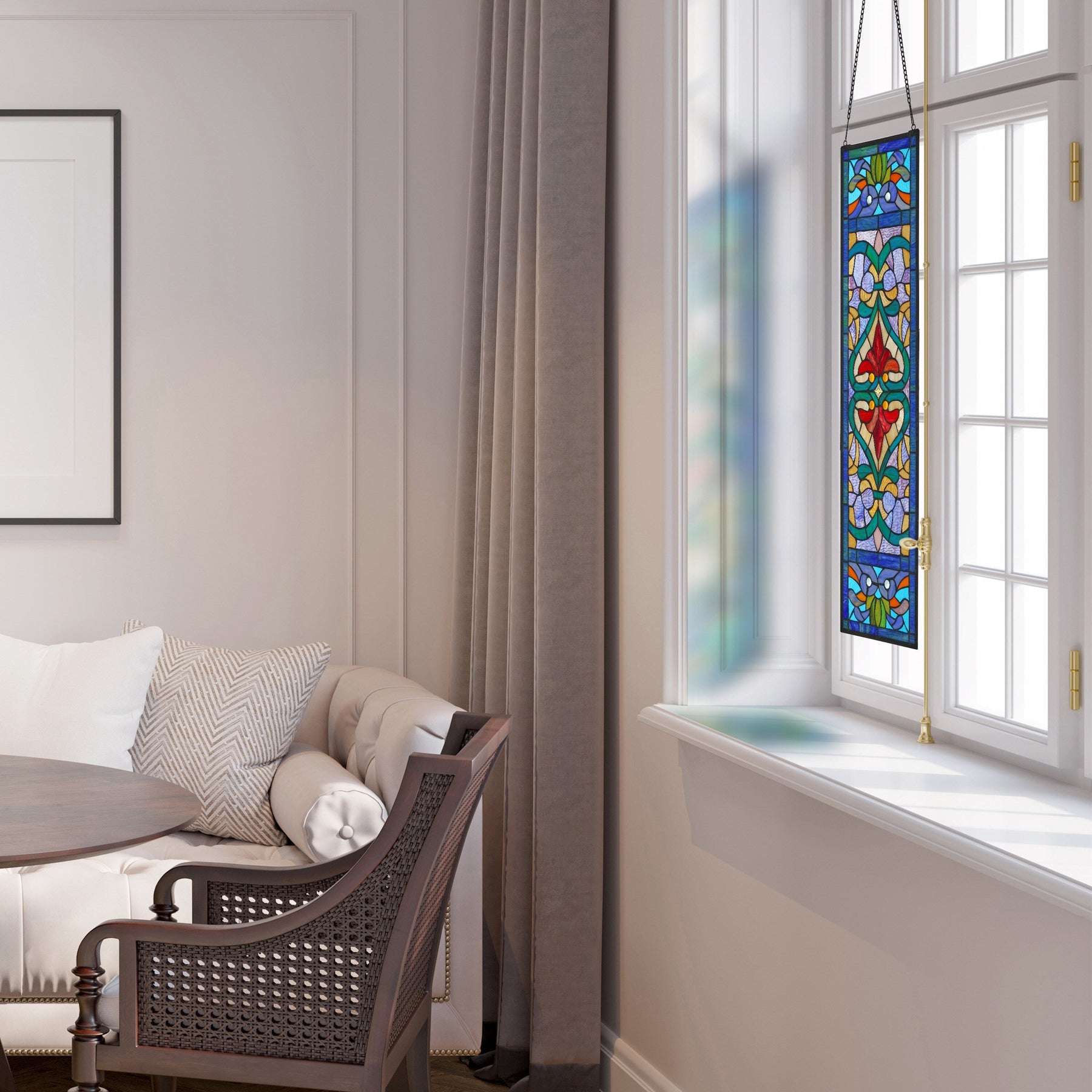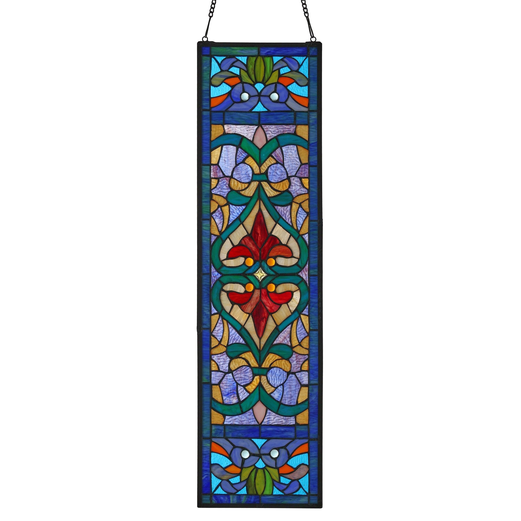 Ajoutez intimité et beauté à votre intérieur avec ce vitrail de style victorien signé River of Goods. Son exquis motif Fleur de Lys est réalisé à la main dans des tons bleu, bleu sarcelle et rouge éclatants qui captent les rayons du soleil et reflètent la lumière dans toutes les pièces. Ce panneau est livré avec une chaîne décorative pour une installation facile et peut être exposé comme attrape-soleil, suspendu au mur ou à côté de votre porte d'entrée. Faites plaisir à vos proches avec ce magnifique vitrail qui apportera chaleur et gaieté à tout espace de vie.