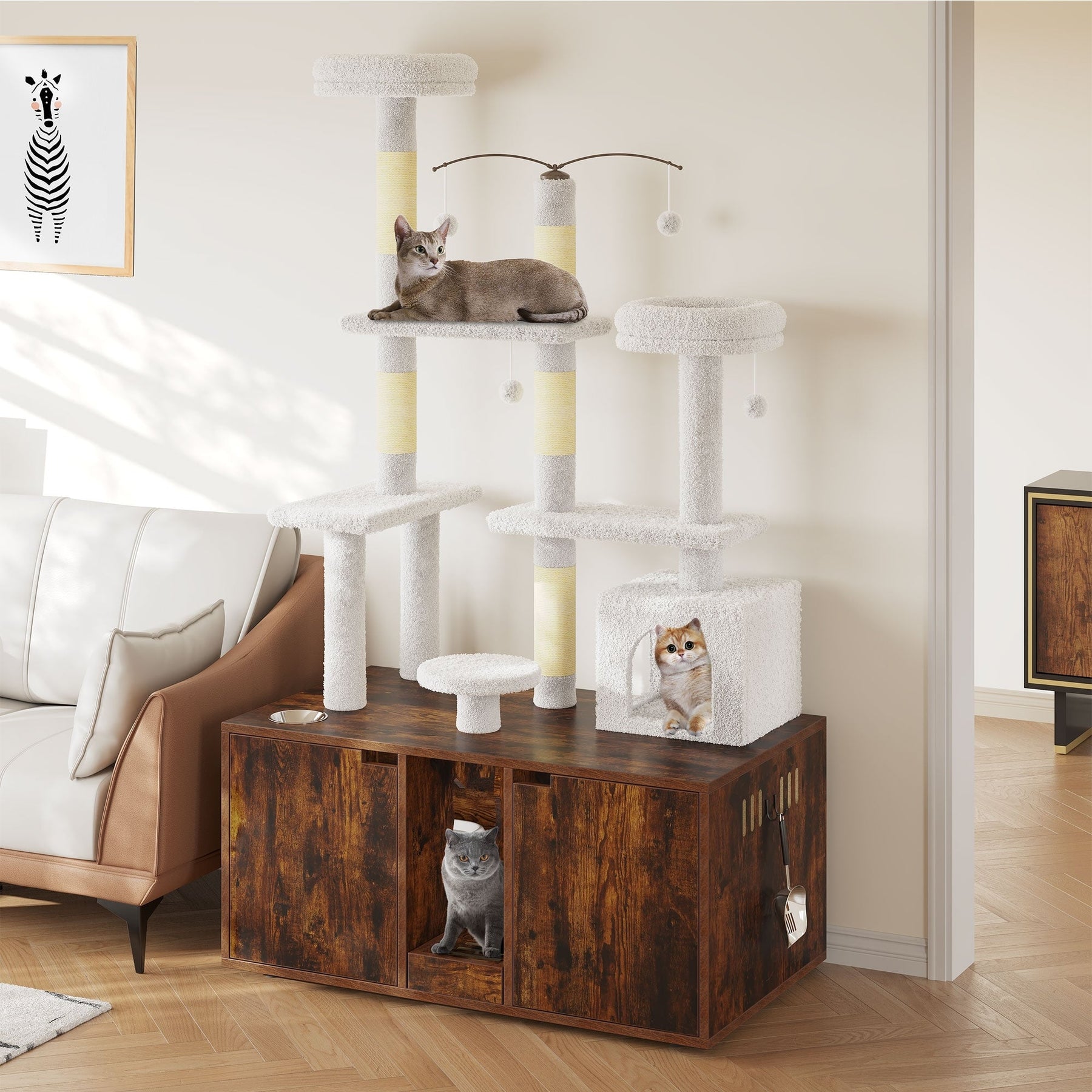 Bienvenue dans ce spacieux enclos à litière double, conçu pour accueillir deux chats et améliorer leur cadre de vie. Ce design innovant allie une maison confortable et un arbre à chat attrayant, permettant un gain de place tout en offrant de nombreuses possibilités d'étirement, de griffage, de repos et de jeu. Fabriqué en bois de haute qualité, ce meuble est doté d'un tissu pelucheux facile à nettoyer et de griffoirs recouverts de corde de sisal, ainsi que de plateformes d'escalade et de niches douillettes pour la sieste et la cachette. L'étagère supérieure amovible et le coussin sont faciles à retirer et à laver, pour un nettoyage simplifié. Créez un havre de paix et de bien-être félin avec ce double enclos à litière !
